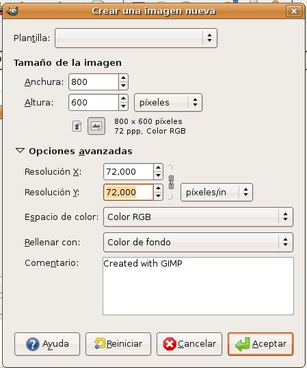 Crea una nueva imagen de 800x600 a 72ppp. Guárdala como cocina.xcf