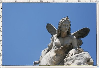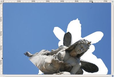 Seleccionamos cualquier área dentro de la imagen. Lo hemos hecho con tijeras, pero podríamos haberlo hecho más fácilmente por selección de color, ya que el azul del cielo es bien uniforme.