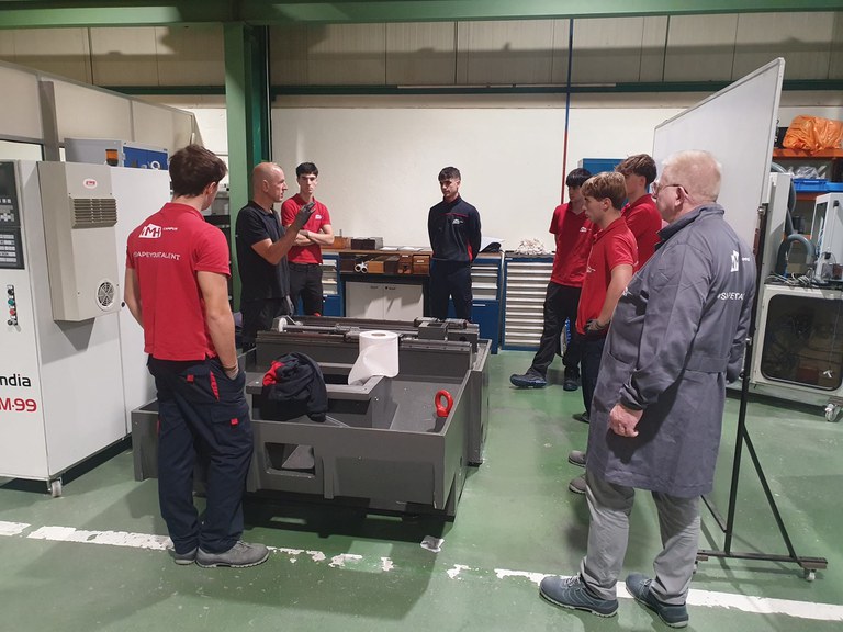 En pocos días, Kari se ha convertido en uno más del equipo. Ha colaborado con el alumnado en las prácticas de hidráulica —¡en inglés, por supuesto!— y también ha participado en la asignatura de sistemas mecánicos, ayudando al grupo de segundo curso en el montaje de máquinas. Además, ha tenido la oportunidad de conocer el centro, otros ciclos formativos y hasta se ha animado a participar en la visita a Danobat junto al alumnado.