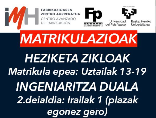 Matrícula Ciclos Formativos: 13-19 / 2ºConvocatoria Ingeniería Dual: 1 de septiembre (si quedan plazas). ¡Infórmate!