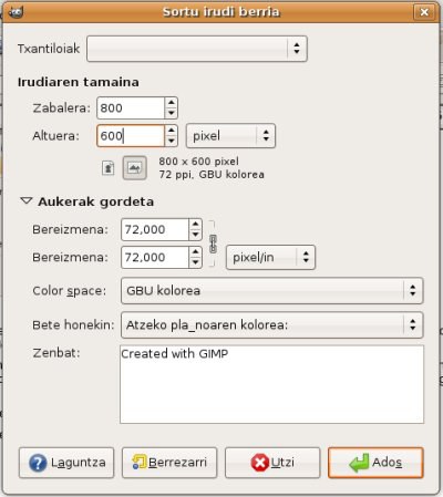 Sortu 800x600-eko irudi bat 72ppp-ko bereizmena duena. Gorde sukaldea.xcf izenarekin.