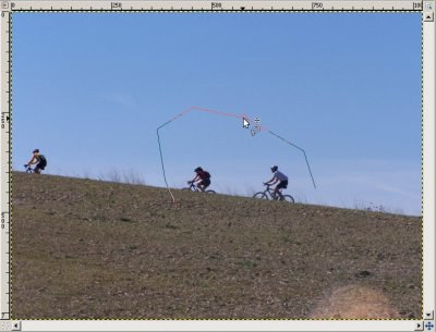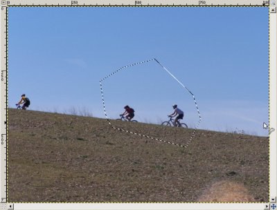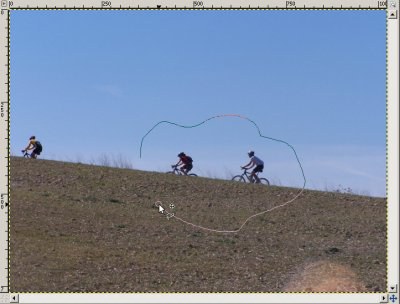 2.4.2 bertsioan egiten dugun bezela, eskuz joan gaitezke egiten trazua (ezkerreko botoia sakatuta edukita eta marrazten joaten gera soltatu gabe). Baina badago ezberdintasun bat: aukeraketa bukatzeko ez da nahiko botoia askatzea. Botoia askatzen dugunean, zirkulu txiki bat irtetzen da azkeneko puntu horretan