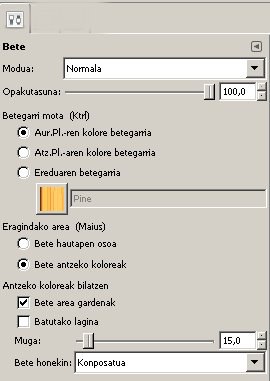- Bete antzeko koloreak: antzeko koloreak dauzkaten eta elkar dauden pixelak bakarrik pintatuko dira. Muga: ikusteko ze ezberdinak izan daitezke koloreak aukeratuta izateko