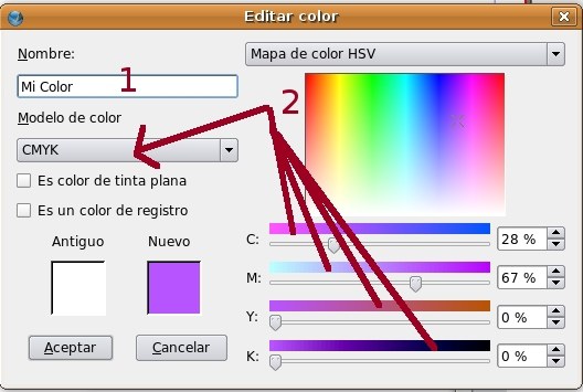 Kolore more bat sortu egin behar dugu. Mi Color (1) deitzen diogu, eta hurrengo baloreekin (2): CMHB, 28%,67%,0%,0%